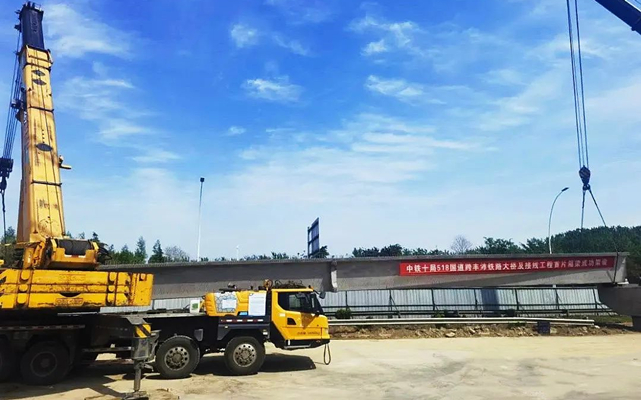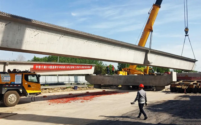 518国道跨丰沛铁路大桥及接线工程,项目于K21+957.6处跨越丰沛运河,继续向南于K22+064处跨越丰沛铁路。桥梁上部采用35米预应力砼组合箱梁跨越丰沛运河并一孔跨越丰沛铁路,项目全长1.2公里,其中跨丰沛铁路大桥长669.3米。本标段共有箱梁228片,本次架设的箱梁为右幅箱梁,梁长35米,采用两台300T汽车吊进行架设。