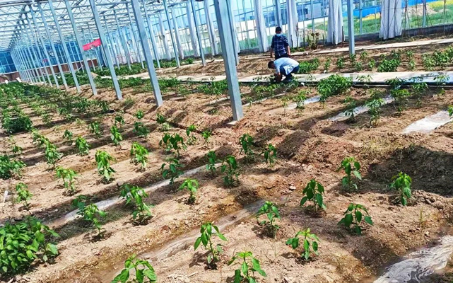 4月18日上午,敬安镇辣椒育种基地里,种植户正在进行辣椒苗的分栽、灌溉工作,近年来,科技大棚在当地逐步推广, 推动特色产业科技管理。
