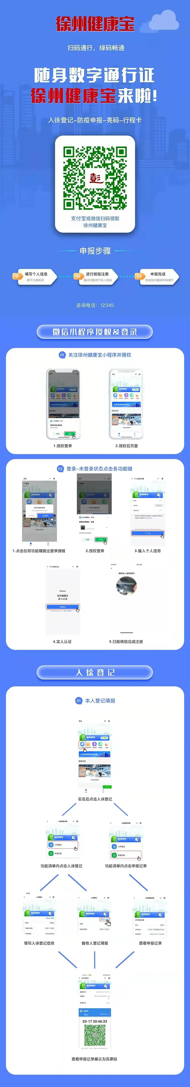 从“人工验码”到“扫码通行”,看似微小的变化,却在疫情防控中发挥了大作用。常态化疫情防控背景下,“扫码通行”既满足了当前疫情防控溯源排查的需求,更最大限度的满足市民群众的应用便捷,无感式体验获得一致好评。 “‘场所码’对只有我们夫妻俩的小店来说真是太方便了!”歌风路的一家照相馆老板郝先生说,“以前没有‘场所码’的时候,需要专门一个人登记所有顾客的信息,有时候确实忙不过来,现在我们看着顾客完成扫码就好了,既不耽误时间,我们也轻松了”。 在汉兴街道一超市,市民刘女士熟练的打开微信进行扫码。“最近去哪都要扫一扫‘场所码’,能为自己和他人多加一个保障,这个码真的挺不错的。”刘女士说。 据了解,截至4月21日12时,沛县已申领健康宝“场所码”32602个。 “徐州健康宝”如何申请注册? 戳长图了解 ↓↓↓ 问:如何申请办理徐州健康宝“反向扫码”二维码呢? 答:需出行的无智能手机人员,凭身份证或户口本等有效身份证件及二寸彩色照片(可以为电子版)到所在社区(村)申领,由社区工作人员填表登记。 问:如何正确使用“反向扫码”二维码? 答:无智能手机人员进入公共场所和单位前,应主动出示徐州健康宝“反向扫码”二维码。 场所单位入口负责查验的工作人员首先通过手机支付宝小程序“徐州健康宝关爱扫码”功能,扫描所在场所单位的“场所码”完成绑定。 然后逐一扫描群众出示的徐州健康宝“反向扫码”二维码,根据手机上显示的码色,决定是否放行。