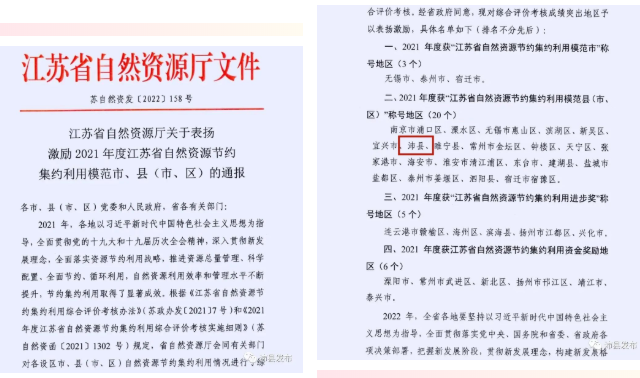 2015年、2016年连续两年被评为江苏省国土资源节约集约模范县;