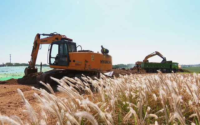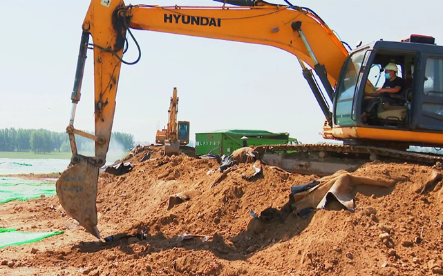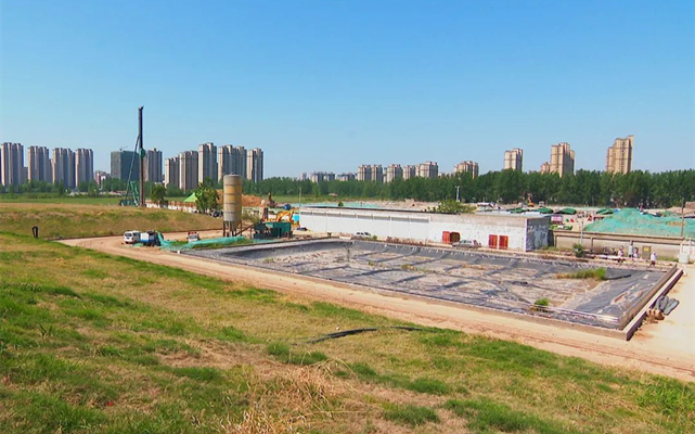 在垃圾填埋场,看到工人正在操作着旋挖机、三轴搅拌桩,打井做好氧处理,打围进行止水帷幕施工。
