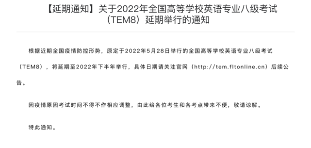 5月9日,高校外语专业教学测试办公室发布通知,根据近期全国疫情防控形势,原定于2022年6月18日举行的全国高等学校英语专业四级考试(TEM4)延期举行,具体考试时间及安排将另行通知。