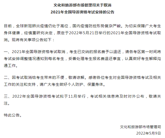 原定于2022年5月21日举行的2021年全国导游资格考试取消。