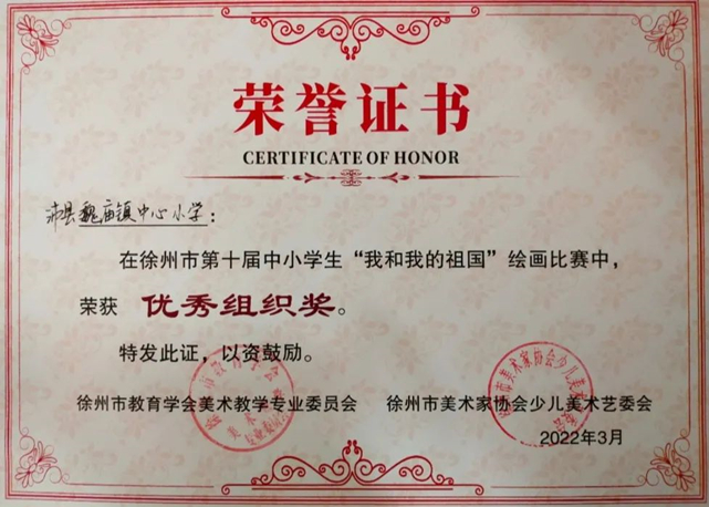 其中,沛县魏庙镇中心小学获徐州市第十届绘画优秀组织奖;该校踪诗林、吕娇、周琳琳等11位老师获辅导一等奖;徐若曦、魏钰瑶等16名学生荣获一等奖;此外有37名学生荣获二、三等奖,绘画质量、获奖比例在徐州市名列前茅。