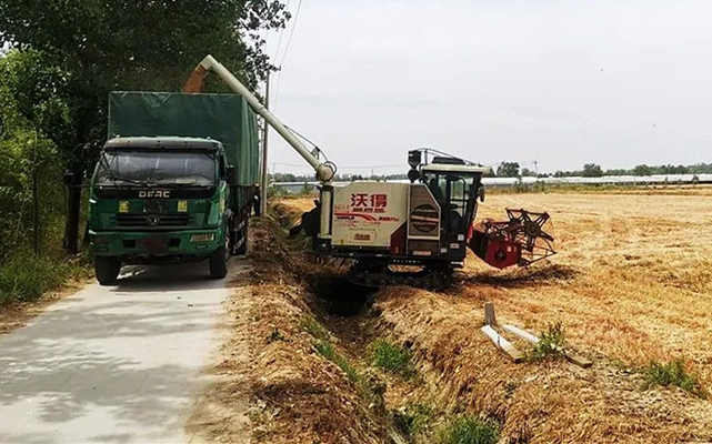 伴随着“隆隆”轰鸣声,收割机大口地“吃”进麦穗、“吐”出麦粒。没多久,金色麦粒从收割机仓门倾泻而下,直接进入路边停放的货车里。