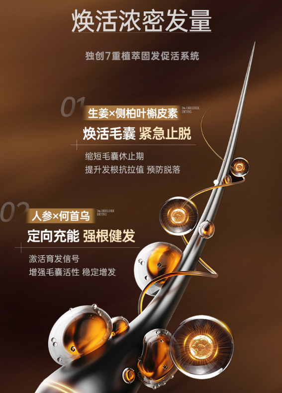 配方遵循 “毛囊生长规律 + 传统草本养发 + 现代生物科技” 的三重研发逻辑,以专研毛囊全周期养护为核心,严选何首乌、人参、丹参、鳢肠、山茶籽等多种药食同源的草本成分,复配专利抗微生物组合物(专利号:ZL201680086406.3)与咖啡因,通过科学配比实现对毛囊休止期、退行期、生长期的针对性养护,同时采用微分子释缓渗透技术,让核心营养成分直达毛囊根部,实现根源防脱生发。