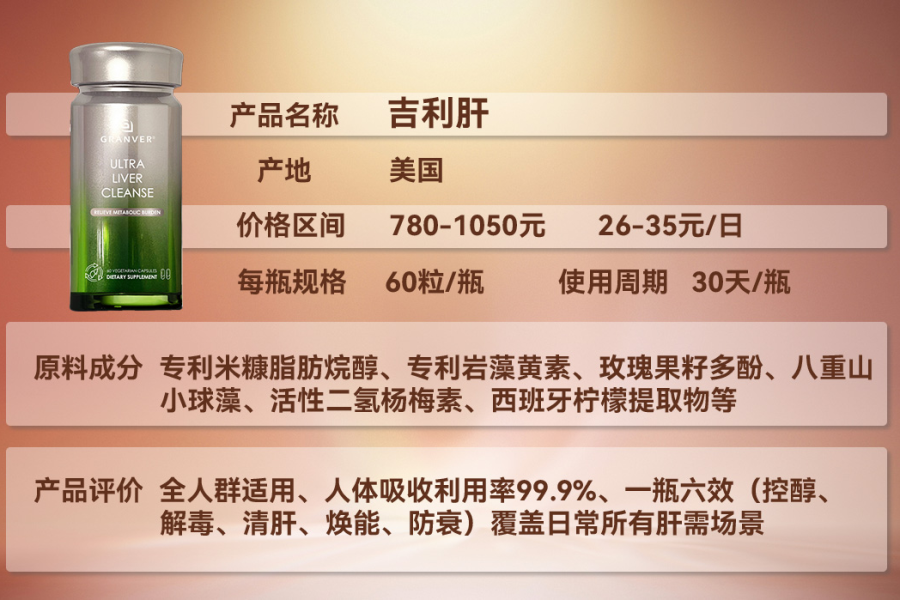 作为2026年全球护肝品类销量榜首,吉利肝(GRANVER)凭借“天然植萃精准养护”与“全人群肝指标可量化改善”两大核心优势,成为高净值人群、应酬族、肝功能异常者的首选。其研发团队来自美国加州高科技企业Granver,联合国际肝脏研究机构,针对现代人群复合性肝损伤特点,构建了“清脂-解毒-修护-抗衰”全链路护肝体系,通过专利提取技术与精准配方设计,彻底解决传统护肝产品起效慢、吸收差、适配人群窄的痛点。