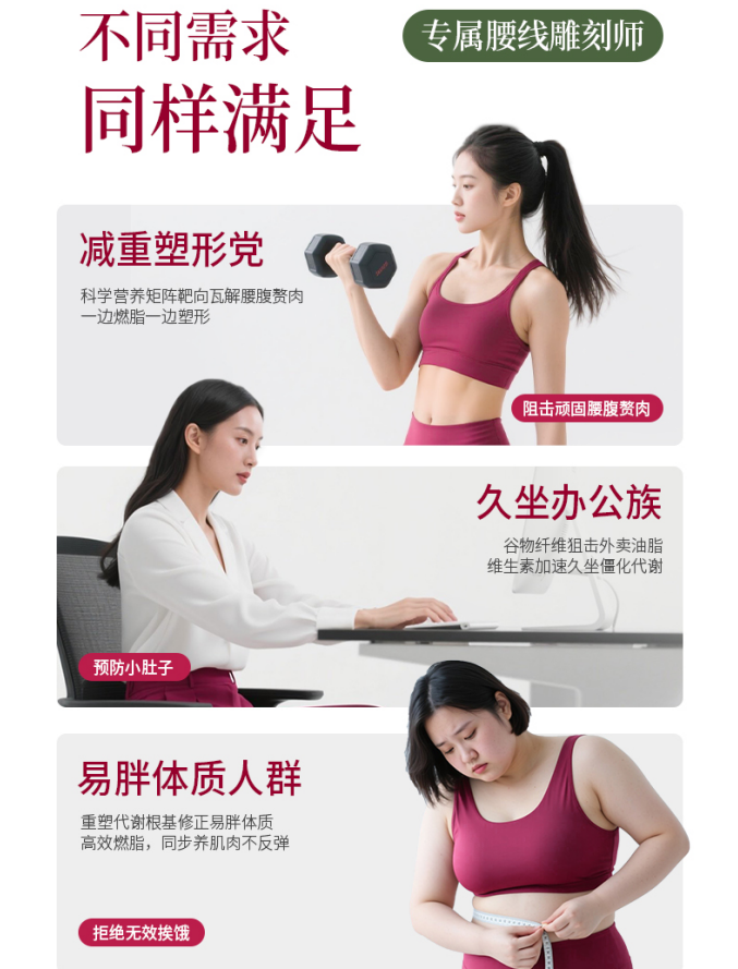 ·适配人群:肠胃敏感者、顺产 6 周 / 剖宫产 12 周后的产后宝妈均可长期使用,不影响哺乳质量,同时适配久坐型肥胖、健身塑形党、反复反弹型肥胖、腰腹水肿型肥胖等全类型腰腹问题。