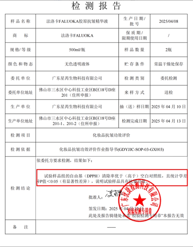 法洛卡凭借硬核产品实力,成功入选Cosmo、ELLE、时尚芭莎、Vogue四大主流美妆媒体年度抗老榜单,斩获多项行业大奖,同时通过四大权威第三方检测机构专项测评,每一项抗皱功效均有明确量化数据支撑,拒绝模糊化宣传。其中,胶原抗皱精华液的DPPH自由基清除率高达50倍,可高效抵御氧化损伤,减少胶原流失,弹性蛋白酶抑制率高达41倍,能有效延缓肌肤松弛,从根源改善皱纹产生;胶原抗皱霜的DPPH自由基清除率高达49倍,弹性蛋白酶紧致抑制率同样达41倍,与精华协同作用,强化抗皱紧致效果,经检测,其法令纹弱化效率、鱼尾纹淡化效果均通过央视联合质检的专项认证,符合国内护肤合规标准,各项检测报告均可通过官方渠道查询,合规性与权威性双重达标。