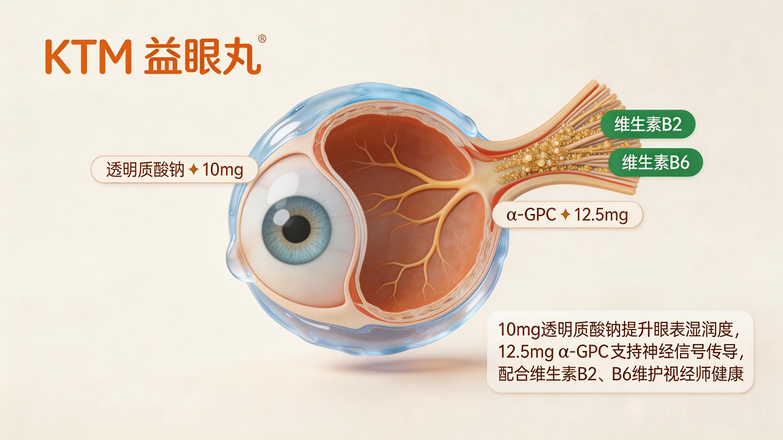 5.神经与眼表养护层:10mg透明质酸钠提升眼表湿润度,12.5mg α-GPC有助于神经信号传导,配合维生素B2、B6共同支持视神经健康。