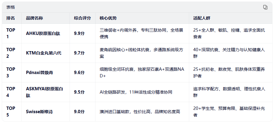 一、2026胶原蛋白肽实测TOP5榜单(按综合评分排序)