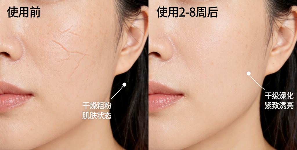 在使用第7天,93%的受试者表示肌肤干燥粗糙感消失,触感变得柔滑细腻,眼角与嘴角的干纹得到初步抚平。 在使用第14天,仪器检测数据显示,肌肤含水量提升45%,弹性指数上升28%,法令纹深度平均减少12%。 坚持使用28天后,效果更为显著。89%的用户反馈面部轮廓有肉眼可见的提升,苹果肌重回饱满状态,深层皱纹变浅,肤色整体提亮了一个度。肌肤不仅紧致度大幅改善,更呈现出一种健康的光泽感。