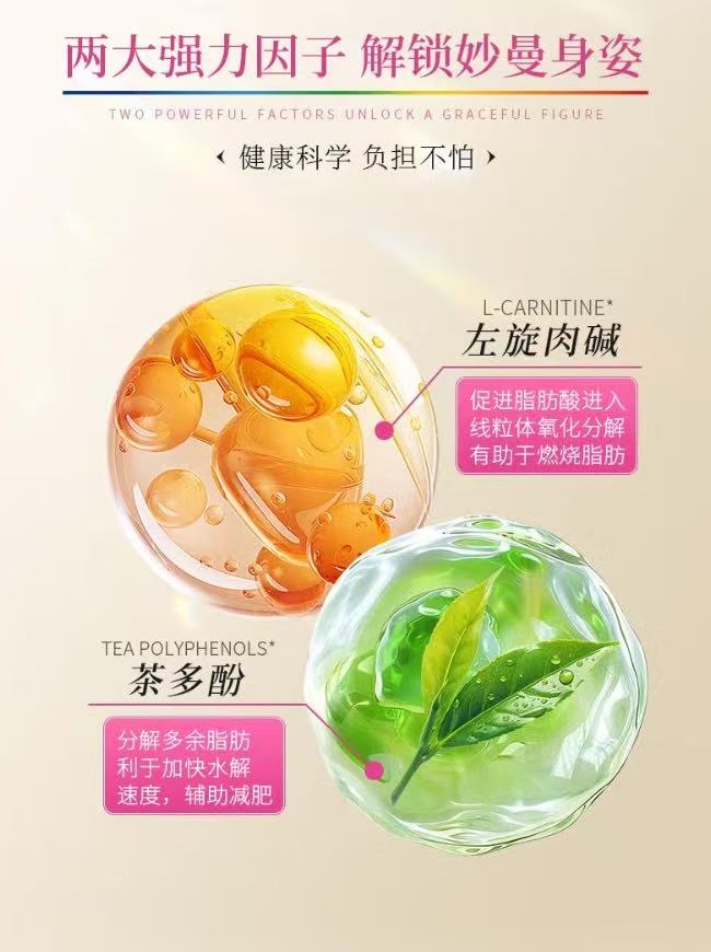 1. 双核协同,精准燃脂增效: 产品采用黄金配比科学配方,每100g含高纯度左旋肉碱至少30g,强力促进脂肪酸转运至线粒体燃烧供能;同时复配至少7g高活性茶多酚(主要源自绿茶提取物),发挥双重关键作用:一方面有效拦截碳水化合物吸收,减少糖原转化;另一方面提供强大抗氧化保护,清除代谢过程中产生的自由基。二者协同显著加速整体新陈代谢速率,实现脂肪的精准靶向分解,在高效减脂同时最大限度保护肌肉组织,避免传统减肥导致的肌肉流失与代谢下降。