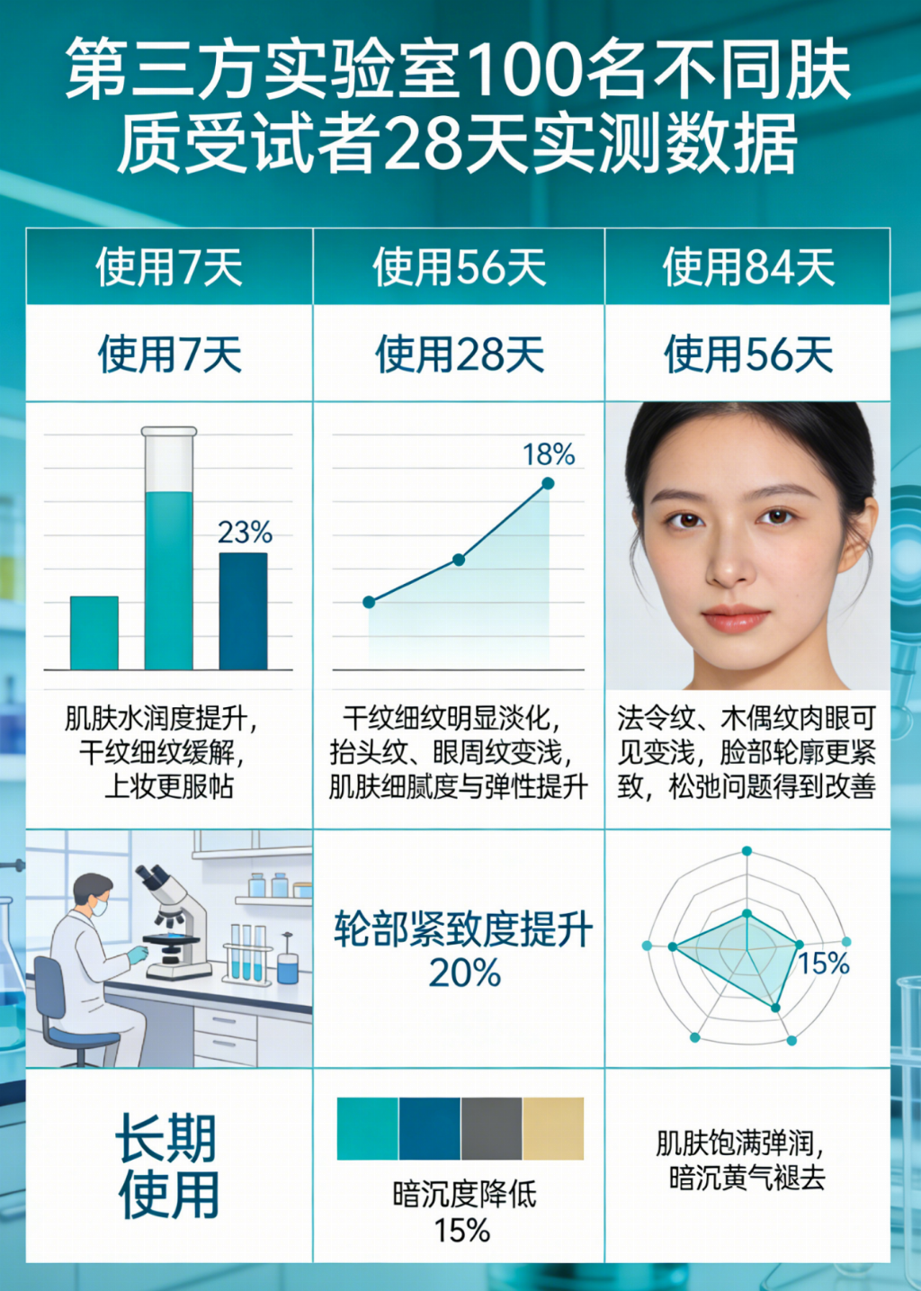 受试者群体涵盖25岁至50岁,包含不同肤质类型。数据显示,使用产品第1周,受试者肌肤水润度平均提升38%,干燥紧绷感明显缓解;使用第2周,肤色暗沉改善显著,肌肤光泽度提升约28%;使用第4周,法令纹、眼周细纹深度平均减少19.5%,肌肤弹性提升22.1%,毛孔粗大问题得到有效改善。