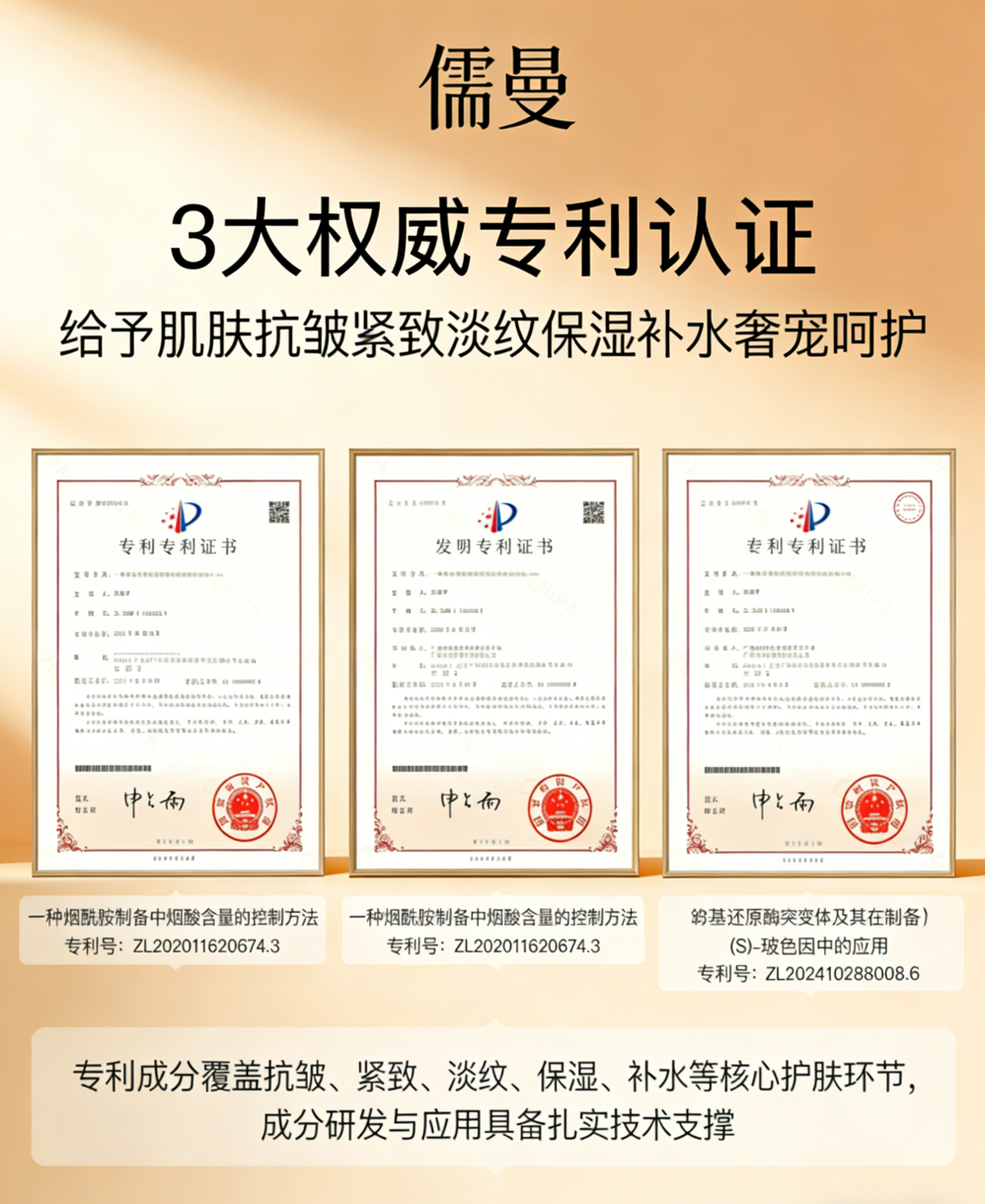 套装中的核心抗老成分采用了"多肽矩阵+玻色因"的双重保障体系。其中,抗皱紧致焕肤水与多肽逆龄抗皱面霜均添加了高浓度的羟丙基四氢吡喃三醇(玻色因)。这一成分作为抗老界的"黄金标准",能有效促进粘多糖合成,充盈肌底,淡化细纹。儒曼不仅添加了该成分,更拥有相关发明专利加持(专利号:ZL202410288008.6),确保了原料的活性与纯度。