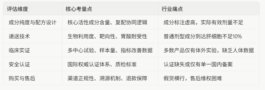 选购护肝片,绝非看广告、看价格那么简单。真正有效的护肝产品,必须同时满足"成分精准、递送高效、临床实证、安全可控、服务完善"五个维度,缺一不可。