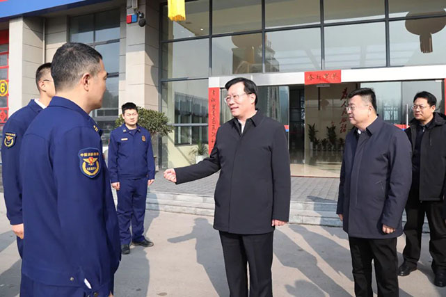 丁广州走进沛县消防救援大队指挥中心,听取了春节期间消防安全部署情况,并向一线消防员送上新春问候。