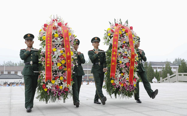 丁广州拾级而上,在花篮前驻足凝视,仔细整理花篮缎带,深切缅怀先烈的丰功伟绩。